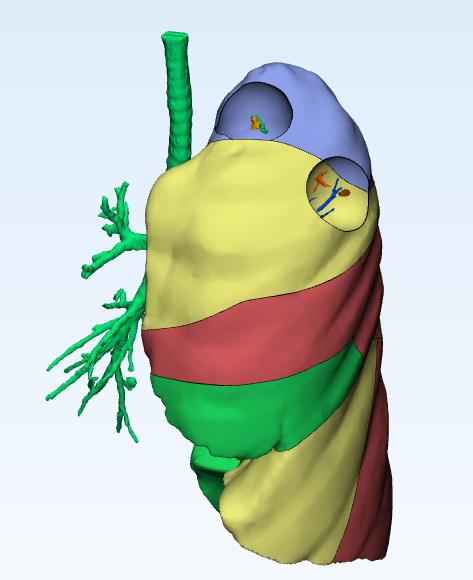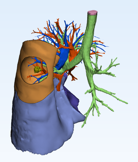 针对结节部位进行结节、气管、肺动脉、肺静脉、肺叶的三维重建;